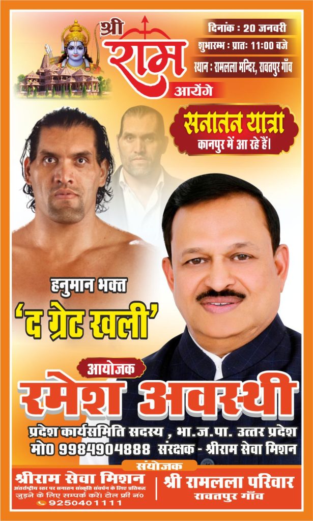 प्रभु श्रीराम जी के भव्य मंदिर के उद्घाटन से पूर्व 20 जनवरी को कानपुर में श्रीराम सेवा मिशन के संरक्षक श्री रमेश अवस्थी जी द्वारा आयोजित होगी भव्य सनातन यात्रा आप सभी श्रीराम जी की होने वाली भव्य सनातन यात्रा में सदर आमंत्रित हैं